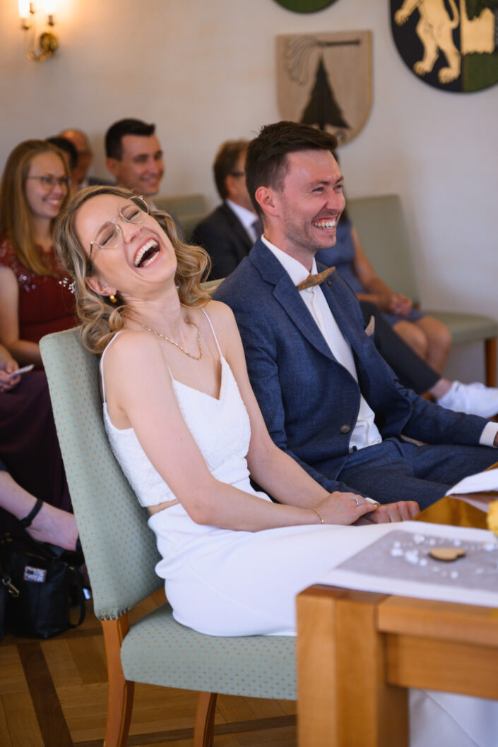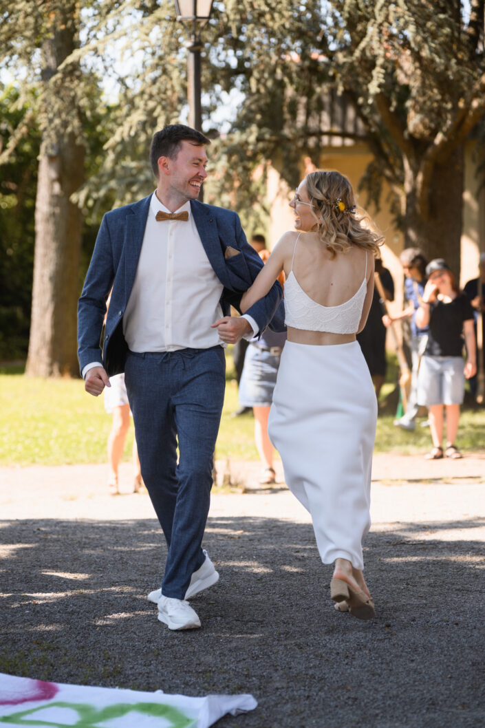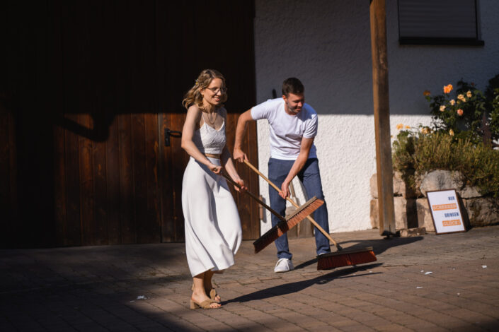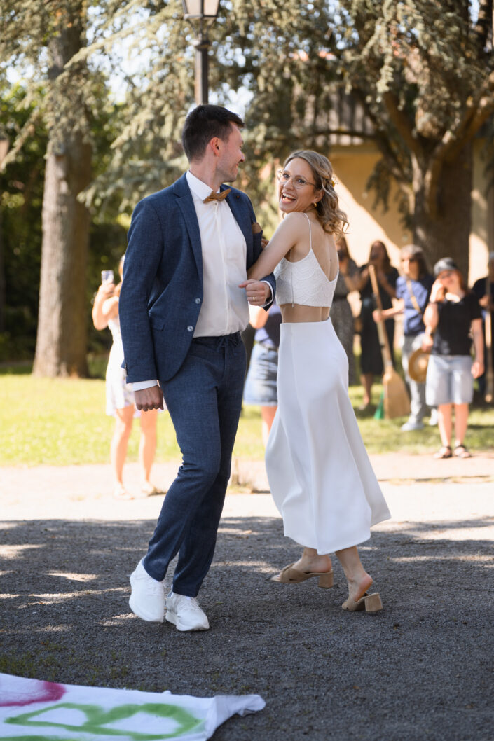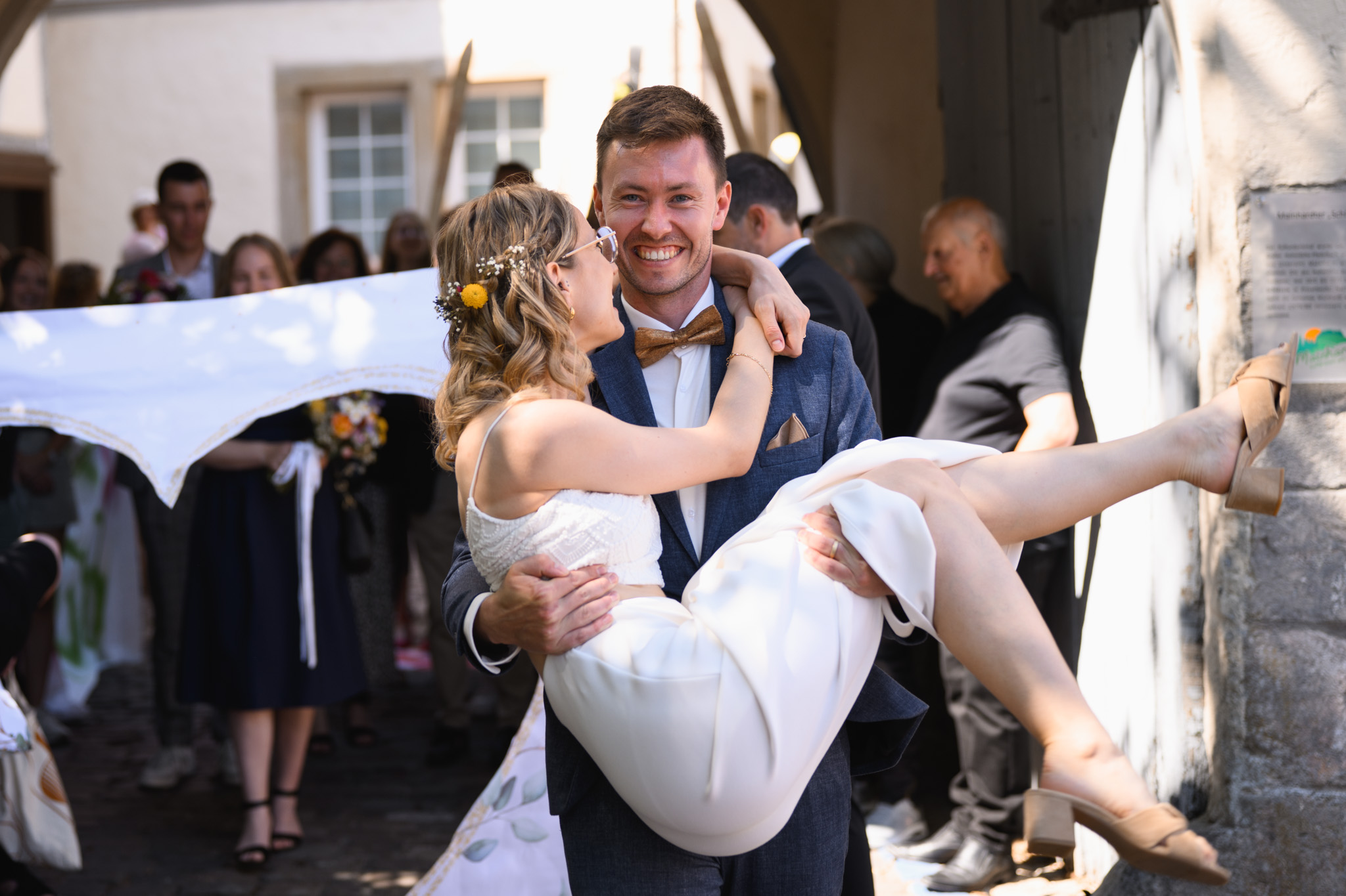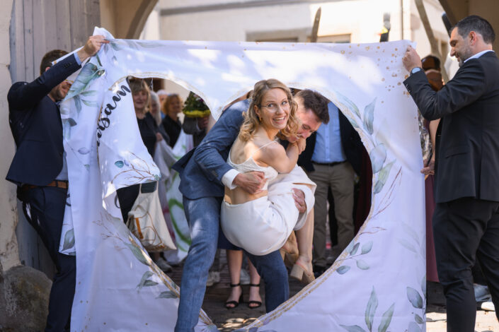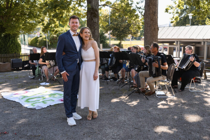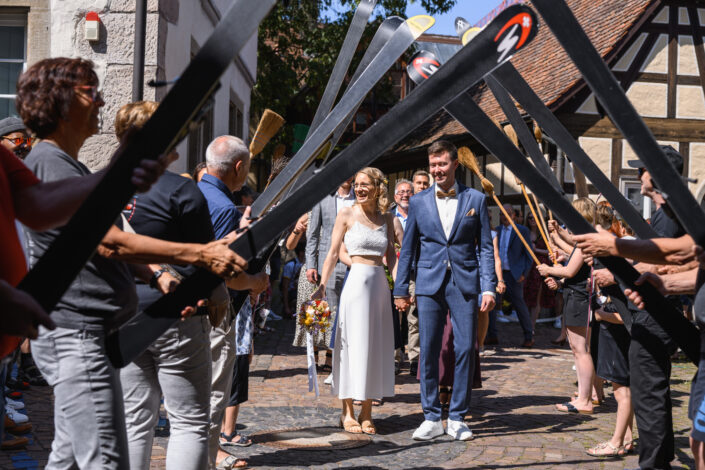 Anschließend gaben sich die beiden im Standesamt in Mainhardt das Ja-Wort. Doch der Weg zum Sektempfang wurde alles andere als gewöhnlich: Das Volleyballteam, der Skiclub und das Akkordeonorchester empfingen das frisch vermählte Paar herzlich und sorgten für ausgelassene Stimmung.