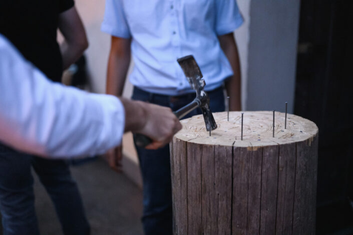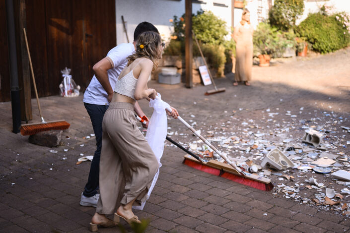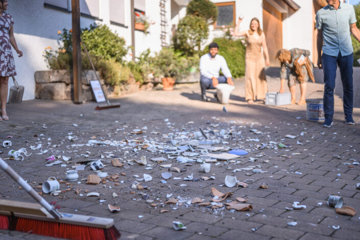 Auf dem Marktplatz wurde dann gemeinsam angestoßen, gegessen und getanzt, bevor es zur Polterhochzeit auf das Weingut Hammel ging. Bei gutem Essen, feinem Wein und fröhlicher Musik wurde bis in den Abend gefeiert – und natürlich durfte beim Poltern ordentlich Lärm gemacht werden.